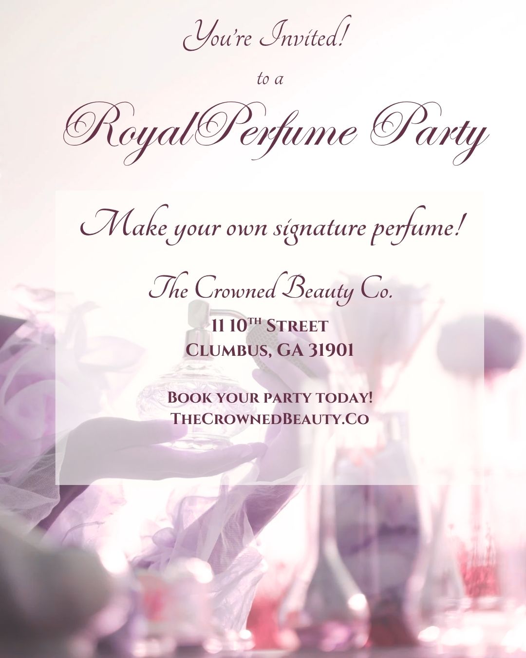 Join us for an elegant Crowned Beauty Perfume Party, where you’ll craft your signature fragrance from a selection of exquisite oils and botanical essences.