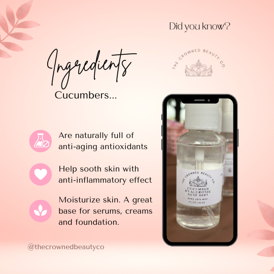 Our Cucumber Hyaluronic Acid Facial Mist is full of good-for-your-skin ingredients: