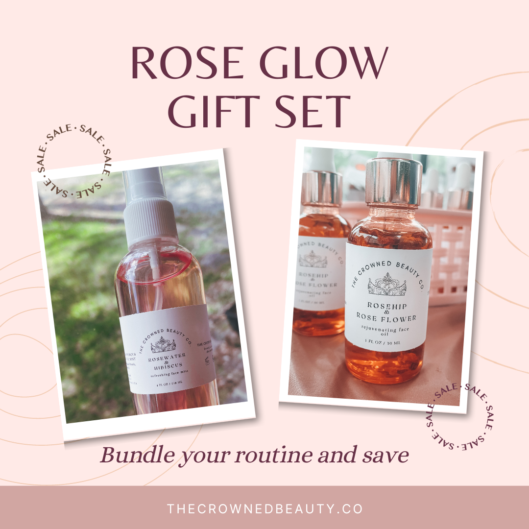 Indulge in the perfect skin care set for your daily ritual. Our Rose Glow Skincare Gift Set utilizes the natural skin benefits of rosewater, combined with organic rosehip oil to help leave your skin fresh and nourished.Â