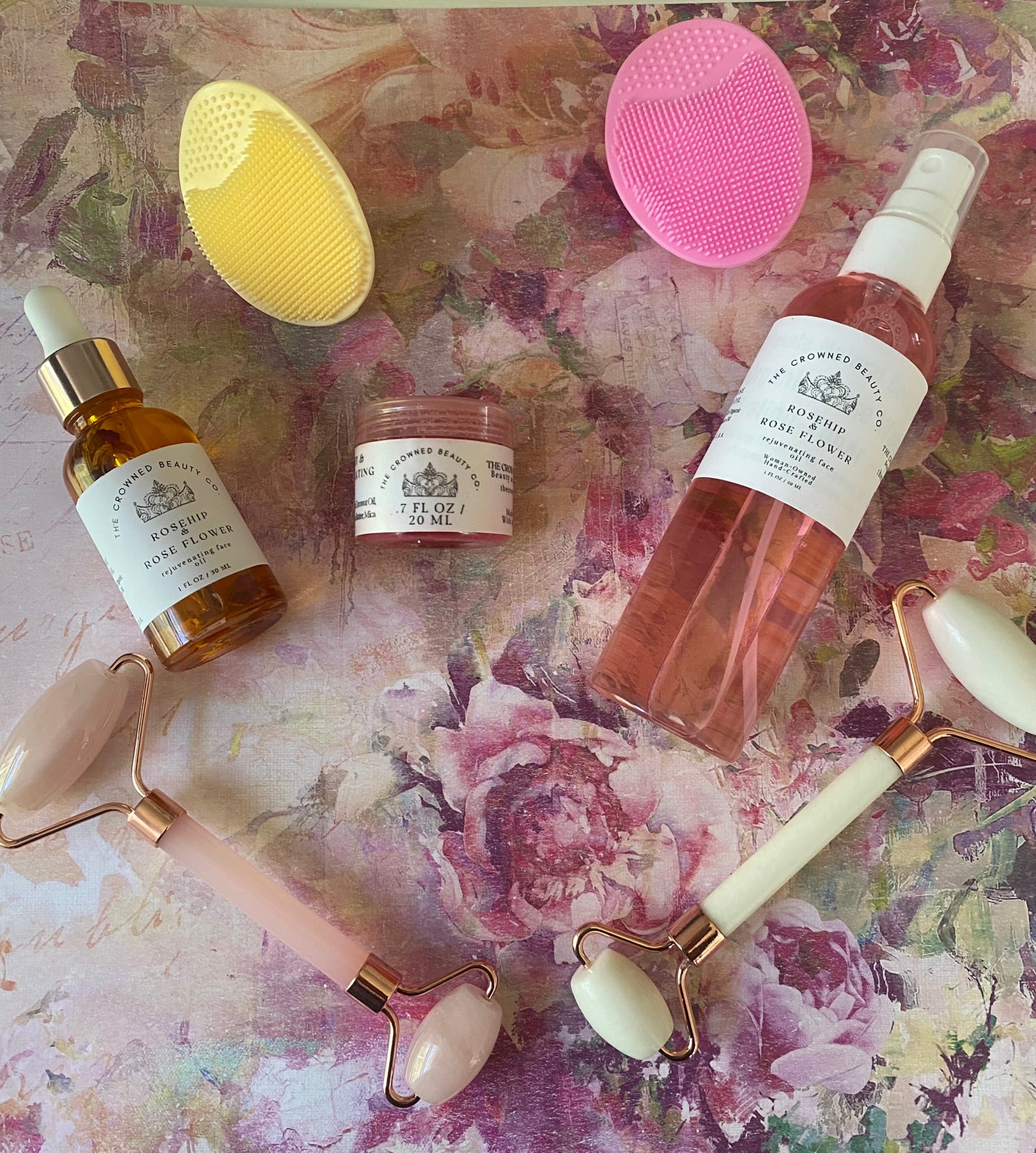 Organic Rosehip Oil, Jojoba Oil, Rose Essential Oil, Rose Petals, Fragrance Oil.