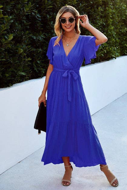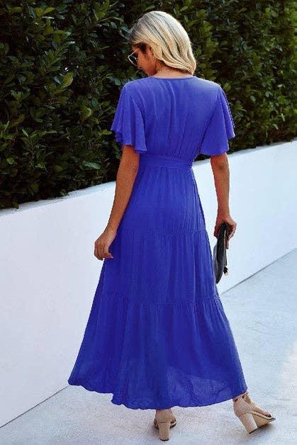 The deep V-neck and ruffle detail add a touch of sophistication, while the rich royal blue color exudes exclusivity.