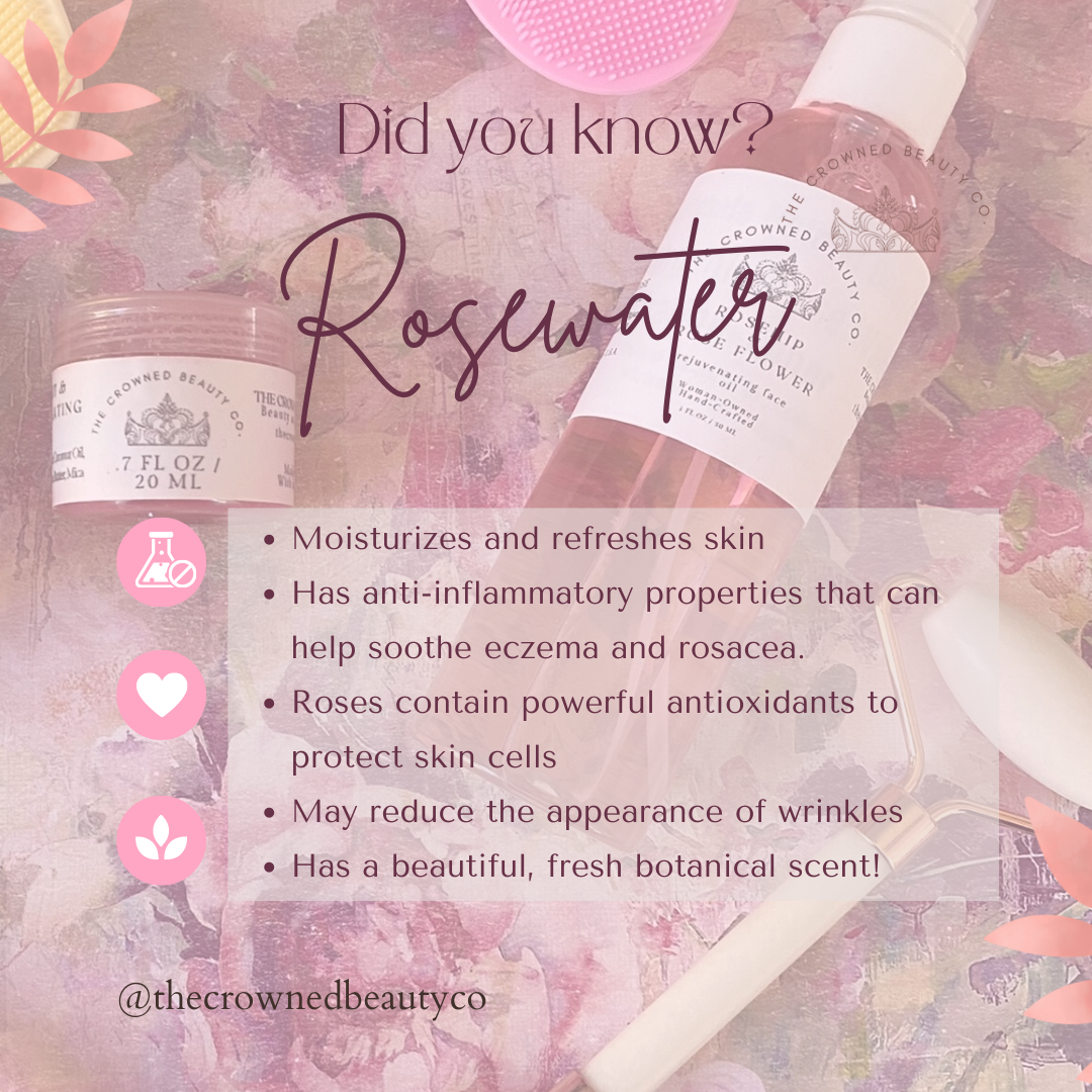 - Rosewater, Aloe Vera, and Hibiscus Extract instantly hydrate and soften skin.