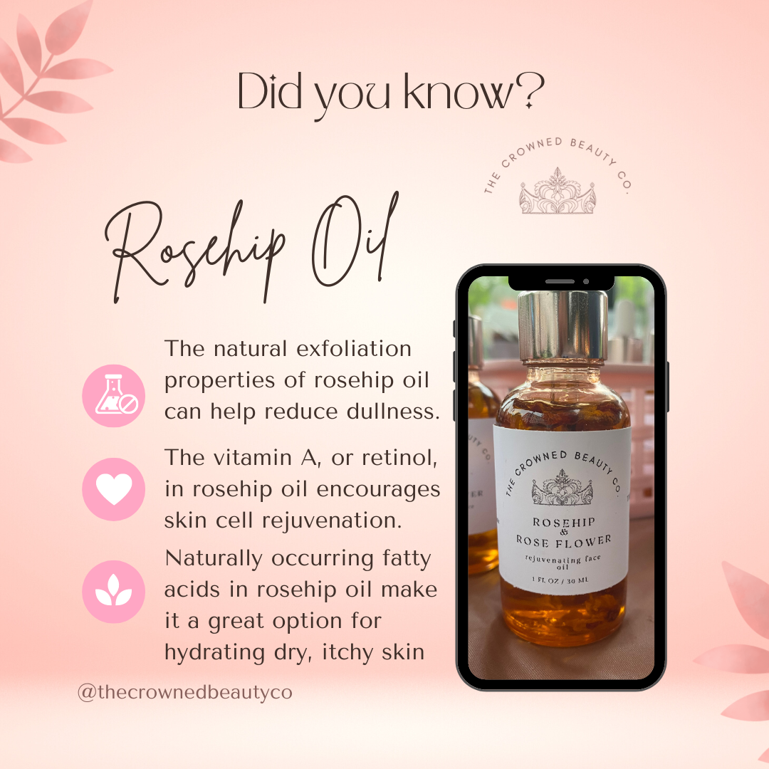 Organic Rosehip Oil, Jojoba Oil, Rose Essential Oil, Rose Petals, Fragrance Oil.